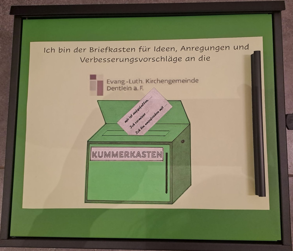 - Beschwerdeformular auf Website, ausgelegt im Foyer des Gemeindehauses und in der Kirche. Dieses Formular kann in den Briefkästen der Kirchenvorsteher, des Pfarramtes, dem Briefkasten am Gemeindehaus oder per E-Mail an pfarramt.dentlein.forst@elkb.de abgeben werden. Die Beschwerden, werden in der monatlichen Kirchenvorstandssitzung gesichtet und bearbeitet, anschließend erhält der Hinweisgeber eine Rückmeldung über den Stand der weiteren Bearbeitung.